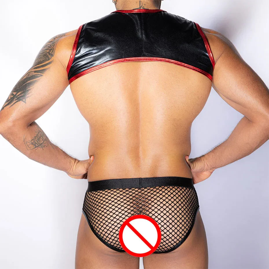Men Leather Bodysuit & Pants Set Alluring Lingerie